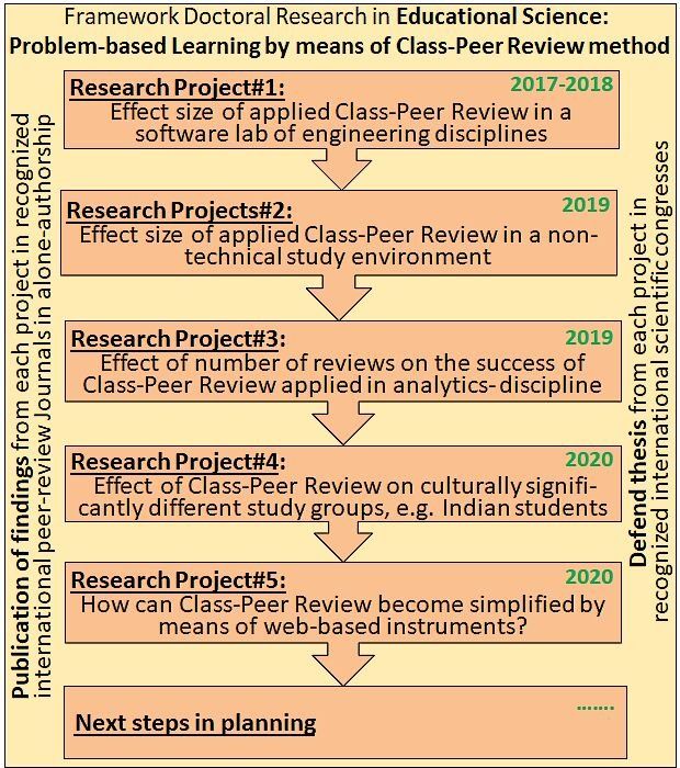 My Doctoral research in social science investigates the effectiveness of activating teaching methods related to Problem Based Learning (PBL). Since my lectures cover very different subject areas and I teach both German and international study groups, there are many opportunities to use different teaching methods and gain valuable experience. My research design is based on quasi-experimental studies with conscious selection of certain dependent variables and effect measurement through group evaluations. After statistical significance tests, relations between the teaching method and student results or their attitudes can be derived from the findings. This PhD research is based on my studies at the Faculty of Social Sciences at the University of Applied Sciences Karlsruhe, my studies of economics at the University of Hagen and my education as a lecturer at the Center for Higher Education and Teaching at the DHBW in Heidenheim